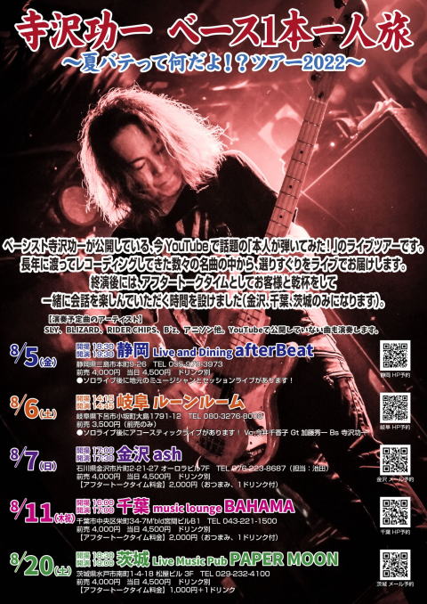 ベーシスト寺沢功一が公開しているYouTubeで話題の「本人が弾いてみた!」のライブツアーです。終演後にはアフタートークタイムとしてお客様と乾杯をして一緒に会話を楽しむ時間を設けました。